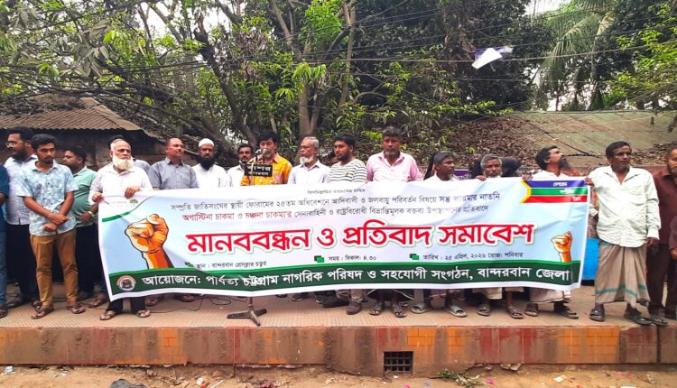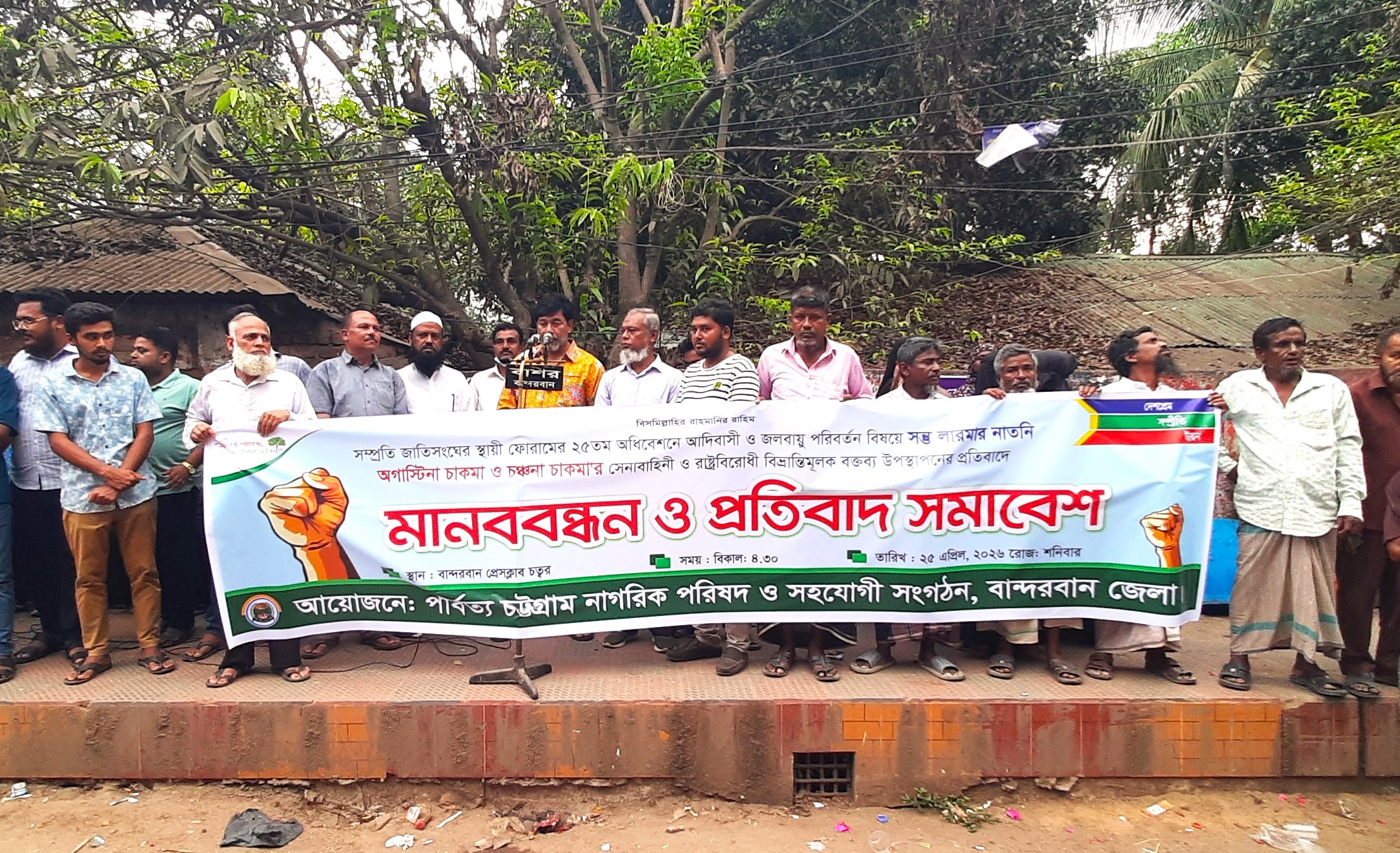 আজ ২৫ এপ্রিল (শনিবার) বিকেলে বান্দরবান প্রেসক্লাবের সামনে পার্বত্য চট্টগ্রাম নাগরিক পরিষদ ও সহযোগী সংগঠনের আয়োজনে এই মানববন্ধন ও প্রতিবাদ সমাবেশ অনুষ্ঠিত হয়।